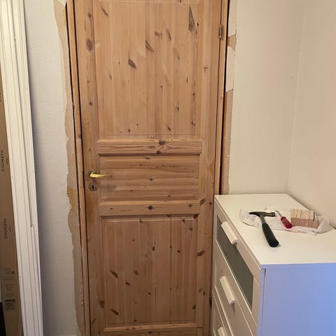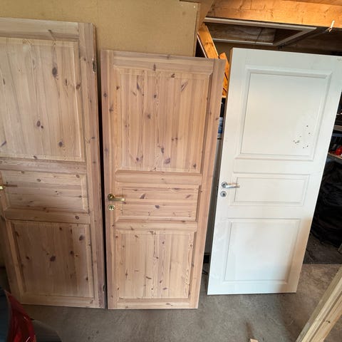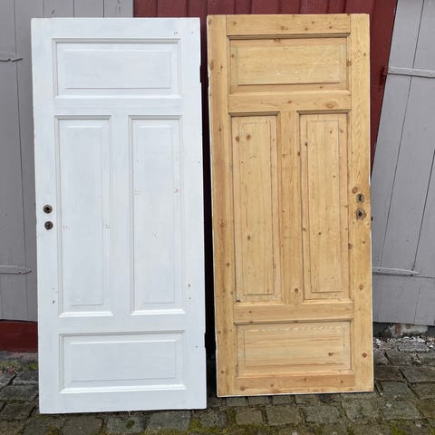Innvendig fyllingsdør i tre. Døren har klassisk fyllingsdesign med flere rektangulære felt. Den er malt i ulike farger på hver side, med synlig beslag og dørhåndtak. Egner seg som innerdør i bolig eller hytte, eller til gjenbruk i oppussingsprosjekter hvor man ønsker en tradisjonell tredør med karakter.