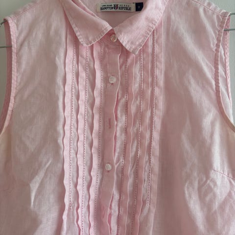 Hampton Republic 27 ermeløs topp for dame i størrelse XS. Toppen er laget i lin og har en lys rosa farge. Den har krage og knappestolpe foran, samt lett A-fasong med splitt i sidene. Ryggen har en fold som gir ekstra vidde. Egner seg godt til bruk alene eller under jakke eller cardigan. Bare helt nydelig på 💕