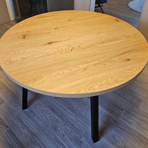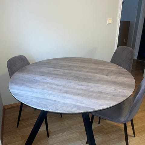 Grått, rundt bord med svarte ben, diameter 120 cm. Pent brukt.