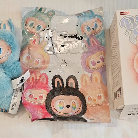 Ekte labubu fra Pop Mart selges. Det følger også med gavepose, eske, merke og handleposen hvis ønskelig. Har kun stått fremme i hylla til pynt.