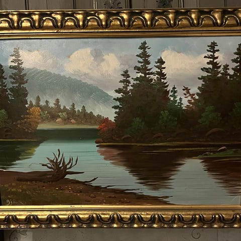 Landskapsmaleri med vintermotiv, utført i olje på lerret. Motivet kan være fra Bærum eller andre steder på Østlandet. Signert HOLST 96. Bilde er vakkert og stemningsfullt.Bildet viser snødekt skog, vannspeil og høye trær i forgrunnen. Maleriet er innrammet i en profilert, dekorert treramme med gullfarget overflate. Egner seg som veggdekor i stue, gang eller andre oppholdsrom. Størrelse 130x83 på maleriet m/ramme 154x109. En skade på bilde.