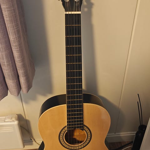 Gear4music klassisk gitar i naturfarget utførelse. Kroppen har lys topp med dekorert rosett rundt lydhullet. Gitaren har nylonstrenger, klassisk hode med åpne stemmeskruer og gripebrett med båndmarkeringer langs kanten. Passer til generell klassisk gitarspilling, øving og undervisning.