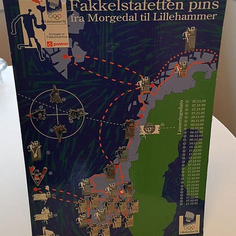 Samling OL-relaterte pins og medaljer fra Lillehammer-OL i 1994. Inkluderer blant annet brett med Fakkelstafetten-pins «fra Morgedal til Lillehammer», flere enkeltstående pins med ulike motiver, samt medaljer med OL-symboler og bånd i flere farger. En av pinsene er montert på en steinblokk. Egnet for samlere av OL-effekter og sportsrelaterte pins og medaljer.