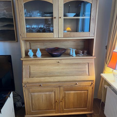 Glassdører øverst til glass/servise, praktiske skuffer nederst.