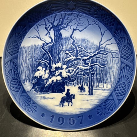 Motiv med to hester i stallvindu, utført i blå-hvite nyanser. Tekst på baksiden: «Julemat i stalden / Christmas Night in the Stable / Limited Edition» samt stempel med produsent og modellnummer 9175. Egnet som samlerobjekt eller veggdekorasjon.