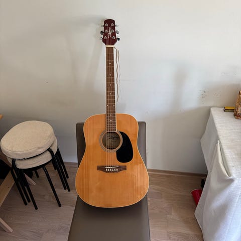 Den er godt tatt vare på og fremstår som hel og pen, uten sprekker. Klassisk dreadnought-modell som passer fint til både fingerspill og komp.