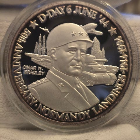 Myntbrev som ble utgitt til markeringen av 60-årsjubileet for D-dagen søndag 6. juni 2004, bærer et fransk jubileumsfri-merke og en historisk minnemedalje med motiver fra D-dagen. Myntbrevet er førstedagsstemplet i den franske byen Caen på frimerkets utgivelses-dag 5. juni, med et soerstempel fra Det franske postverket. Caen er byen som var hovedmål for D-dagen. Stempelet, som boerer teksten "Landgang og frigjøring 1944 - 2004", gjengir et omriss av Frankrike med et dobbeltkors, innrammet av en ring med de 12 EU-stjernene. Det fargerike jubileumsfrimerket, som er det franske postverkets offisielle utgivelse til markeringen, viser soldater som tar seg frem fra landgangsfartøy-ene. Frimerket, som har verdien 0,50, baerer samme tekst som stempelet. Den historiske minnemedaljen, med teksten "D-dagen 6. juni 1944. gjengir en stilistisk utgave av et angrepskart fra invasjonen, som viser hvor angre pet fant sted. Pregingens revers viser en annen scene fra landgangen med skip i bakgrunnen. D-dagen i Normandie markerte innledningen på "Operasjon Overlord" - det store frem-støtet mot Hitler-Tysklands herredømme i Europa.