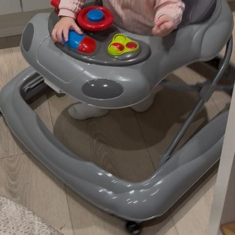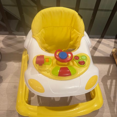 Gåstol i bilform med aktivitetsbord. Setet er polstret og grått, og gåstolen har grønn ramme med gule og røde detaljer. På aktivitetsbordet er det ratt og flere knapper og elementer i plast som barnet kan utforske. Gåstolen har hjul og metallstenger som støtte under rammen. Egnet for små barn som øver på å stå og gå, under tilsyn av voksen.