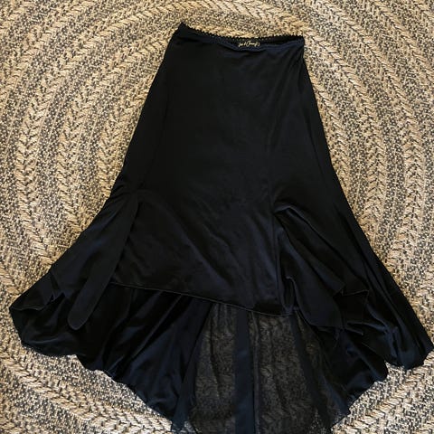 Selger et svart skjørt fra Saloos Collection. Skjørtet har et unikt asymmetrisk snitt nederst som gir et flott fall og fine bevegelser.
