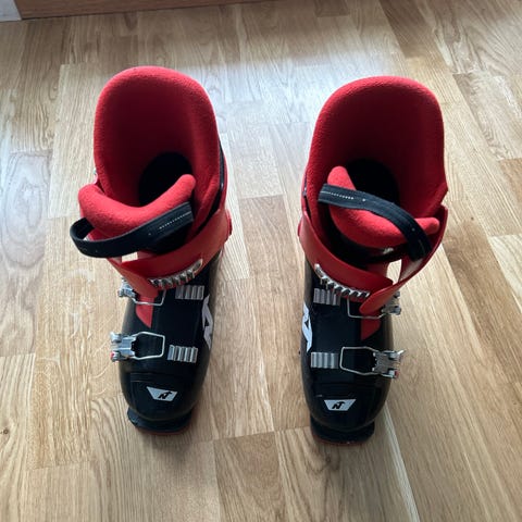 Nordica Dobermann alpinstøvler for barn i størrelse 24,5 (ca. 38 EU). Støvlene har ytre skall i grønn og svart plast med spenner i metall og plast for justering av passform. Innermodellen er polstret i grått tekstil for komfort og varme. Egnet til alpint bruk for barn som trenger stabile og støttende skistøvler til bruk i alpinbakke.