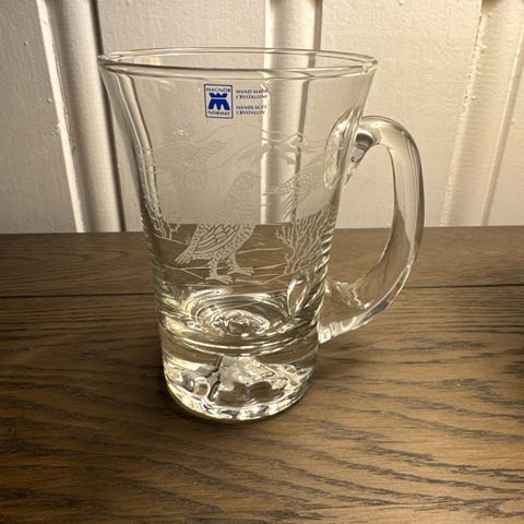 Magnor Glassverk Norske Løve glasskrus i klart glass. Kruset har kraftig fot og hank, og er dekorert med inngravert motiv av skipet «Norske Løve» på siden. Egner seg til servering av varme eller kalde drikker ved borddekking eller til hverdagsbruk.