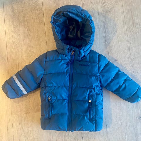 Stormberg dunjakke for barn i størrelse 92. Oppleves som litt stor i størrelsen. Jakken er blå og vattert med dunfyll. Den har avtagbar hette, glidelås i front og to glidelåslommer foran. På ermet er det refleksstriper for bedre synlighet.