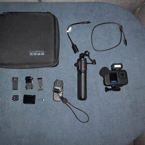 GoPro max 360 actionkamera med tilbehør. Kameraet leveres med etui, håndgrep/forlengerarm, stativ og to utskiftbare linsebeskyttere. Egnet for opptak av video og bilder i ulike aktiviteter, både innendørs og utendørs, samt montering på forskjellige fester gjennom standard GoPro-feste på kamerahuset.