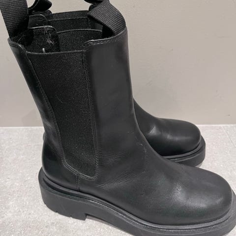 Kjempefine skinnstøvletter i str. 38. Ikke så høye (27 cm). Litt mørke på tuppen. Mulig dette går bort med litt behandlingsprodukter for skinn.