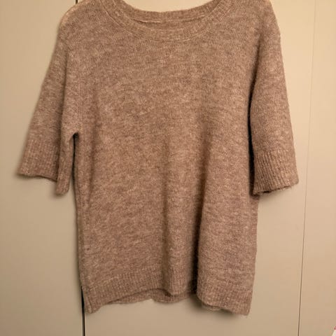 Lindex genser for dame i størrelse XS. Genseren er beige. Modellen har løs passform med halvlange ermer og rund hals.