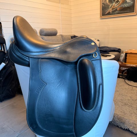Pent brukt, kun en liten ripe på ene knestøtten som ikke er sjenerende eller hull. Se vedlagt bilde. Pen detalj med krystall, for stigbøylerem ellers stilren. Nyvasket trekk følger selvsagt med.