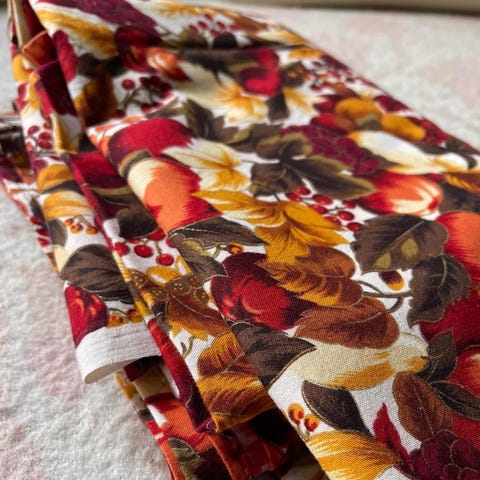 Metervare med blomstermønster i blå og brune toner. Tekstilet har motiv av blader i varme nyanser mot blå bakgrunn. Egnet til sømprosjekter som gardiner, putetrekk, duker eller andre interiørtekstiler.