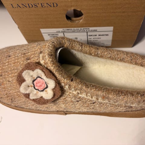 Tøflene er i lilla melert tekstil med dekorativ blomsterdetalj på siden. De har myk overdel og mørk innside, samt såle med struktur for bedre grep. Egner seg som innesko eller hjemmesko.