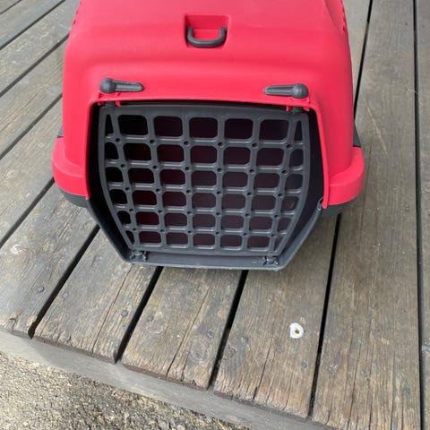 Katt/hund bur transportbag i grått tekstil med svarte detaljer. Vesken har åpning i front med nettingfelt, ventilasjonshull og avtagbar skulderreim. Innvendig ligger en myk pute for komfort. Egnet som transportbag for katt eller liten hund, og kan bæres både i håndtak og over skulderen.