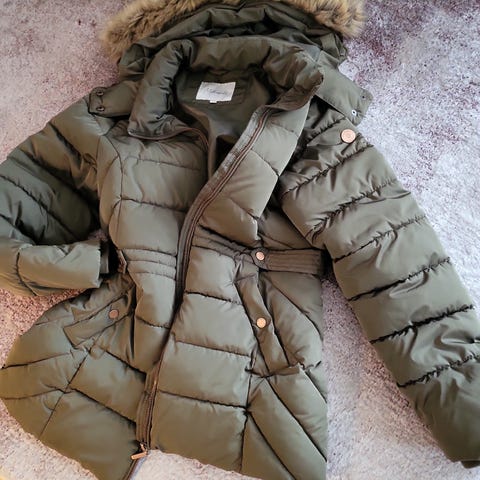 Rett fasong med knappelukking. Stikklommer. Mansjett på ermene. Lett vattert og perfekt mot våren. Nydelig grønnfarge.