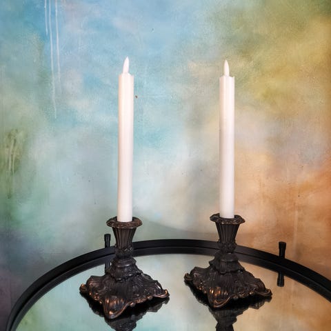 Nydelige lysestaker i barokkstil. Høyde de to store: 45 cm. Bredde 16 cm. Høyde den minste 30 cm. Bredde 12 cm