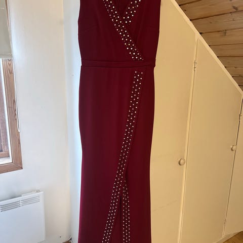 festkjole i størrelse S. Kjolen er blå og laget av polyester. Den er ermeløs med dyp V-utringning og dekor med steiner langs utringningen og nedover fronten. Glidelås i ryggen. Egnet som festkjole til ulike anledninger.