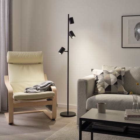 Pent brukt svart stå lampe med gull detaljer, selges uten lyspærene.