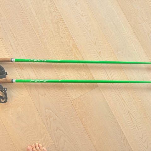 KV+ tornado skistaver i lengde 110 cm. Stavene har blå staverør med røde spisser, håndtak med kork og justerbare håndstropper.