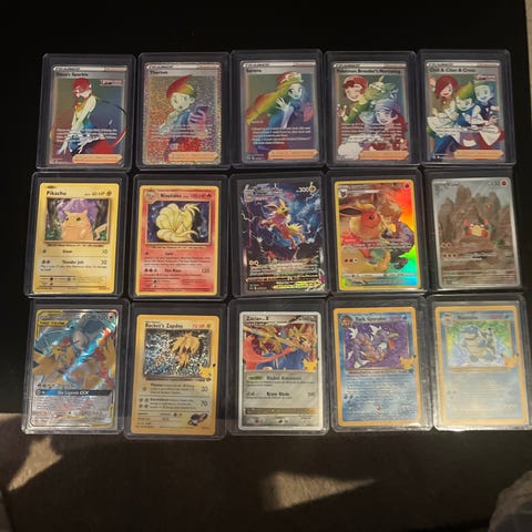 Pokémon samlekort lot. Flere ulike kort vist på bildene, inkludert blant annet Pikachu VMAX-kort og andre motiv. Kortene ligger i plastlommer/toploaders. Egnet for samlere av Pokémon-kort og som tillegg til eksisterende samling. Se bildene for oversikt over hvilke kort som følger med og tilstand på hvert enkelt kort.