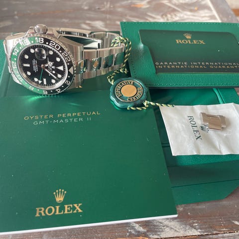 Eskeny og ubrukt Rolex GMT-Master II med referansenr 126713GRNR. Her finner du ikke en eneste ripe eller hairline. Ikke justert til hånd.