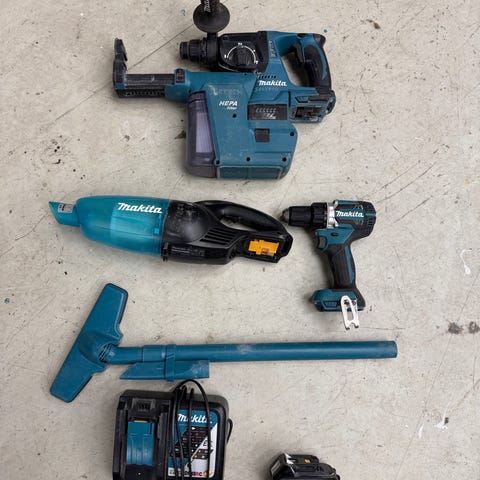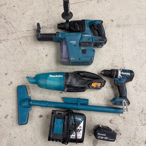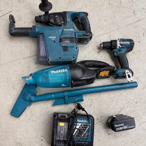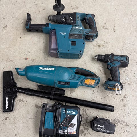 Makita verktøysett bestående av flere 18V maskiner og tilbehør.