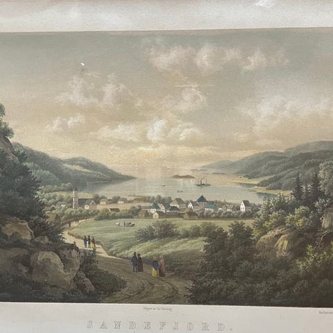 Gammelt kunsttrykk i sort-hvitt med færgestedet i Guulelven (Trondheims Stift), fjell, elv og mennesker i forgrunnen. Motivet viser en bakke ned til færgestedet omgitt av skogkledde åser og fjell i bakgrunnen. Bildet har klassisk, detaljert strek og gir et historisk preg. Egnet som veggdekorasjon i stue, gang eller kontor. Materiale og eksakt størrelse er ikke oppgitt.