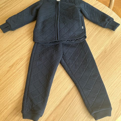 Jakke er fra termo serien og bukse kjøpt til i blå. strikk på buksen nederst, ikke noe hull bare lit gjørme flekker, som jeg ikke har forsøkt vasket bort.