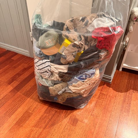 En stor søppelsekk med masse klær str 122/128.
