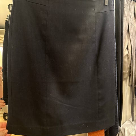 H&M skjørt i ull for dame i størrelse 36. Skjørtet er blått med tynne, vertikale striper (pinstripe-mønster). Det har glidelåslukking og knapp i livet, samt fôr på innsiden for økt komfort. Passer til bruk i hverdagen eller til mer formelle anledninger sammen med skjorte, bluse eller blazer.