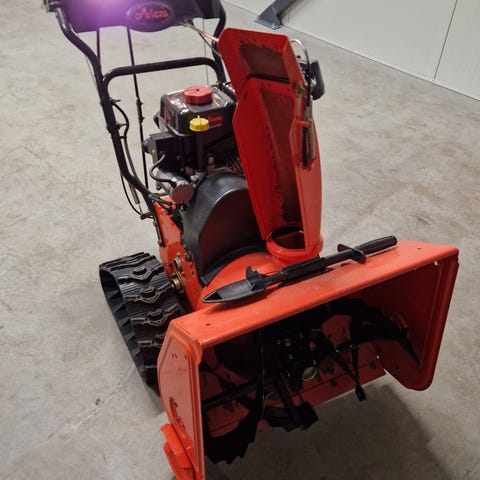 Snøfreser med bensinmotor og to-trinns fresesystem. Maskinen har grovmønstrede hjul for bedre fremkommelighet på snø og is. Freseren har justerbar utkasterrenne og flere betjeningshendler på styret for kontroll av drift og retning på snøutkastet.