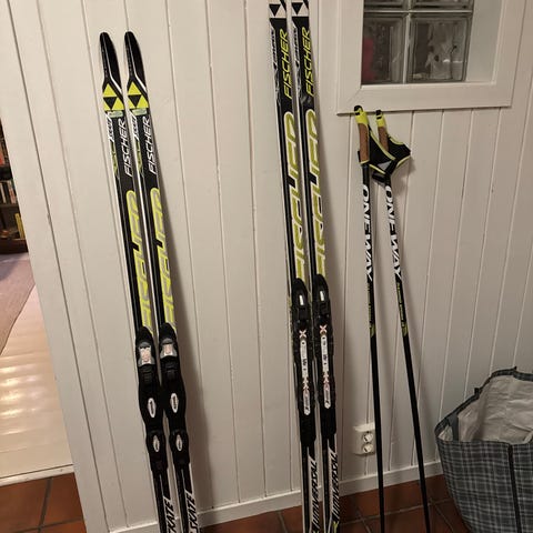 Fischer RCS Sprint (klassisk) og Madshus Hypersonic Skate Jr langrennski med monterte bindinger.