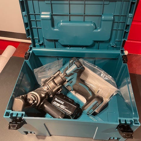 Makita verktøysett bestående av flere 18V maskiner og tilbehør.