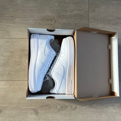 Nike Air Force 1 sneakers i størrelse 45. Modellen er i brun semsket materiale med snøring foran og perforert tåparti for ventilasjon. Yttersålen er i gummi med klassisk Air Force 1-mønster. Skoene passer som fritidssko og hverdagsbruk.