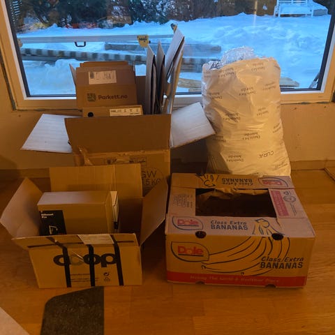 Pappesker egnet som flytteesker eller oppbevaringsesker. Settet består av 5 store esker samt 1 mindre eske, silkespapir/bobkeplast å noen ikeaposer.