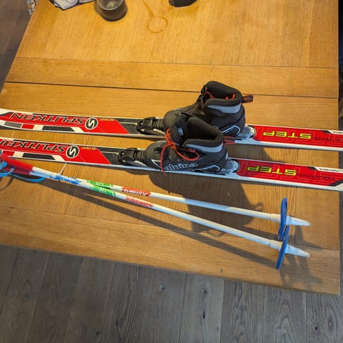 Alpinski og skistøvler barn ulike lengder og størrelser