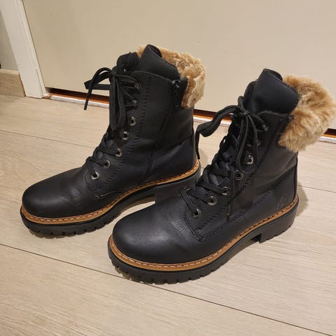 Skoene er brukt gjennom 1,5 vintersesonger, og kvaliteten på skoene er imponerende god. Skoene er jevnlig vedlikeholdt med skokrem. De selges fordi jeg foretrekker å bruke lavere vintersko.