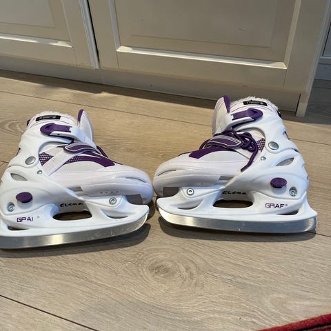 Graf barne skøyter for ishockey, justerbare i størrelse 27–30. Modellen har hard ytterskall i plast med myk, polstret innersko for støtte og komfort. Skøytene har kombinasjon av borrelåsrem og spennelås for enkel tilpasning og god støtte rundt ankelen. Blad i stål egnet for bruk på isbaner. Fargekombinasjon svart, blå, grå og hvit, tilpasset barn.