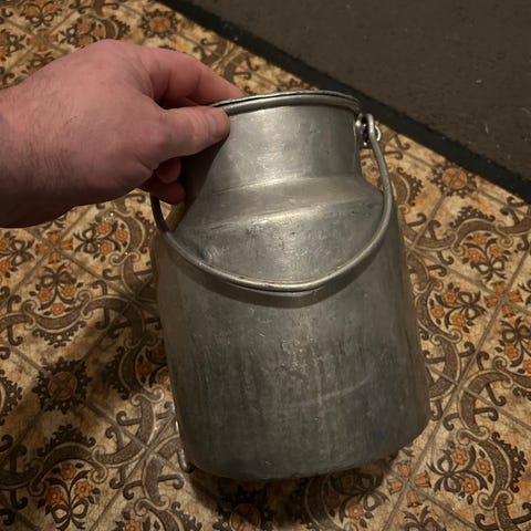 Melkespann i metall med hank og avtagbart lokk. Spannet er laget i metall, trolig aluminium, og har bærehank festet på sidene. Lokket har håndtak på toppen for enkel av- og påsetting. Egnet som oppbevaringsspann, dekorelement eller til praktisk bruk der et solid metallspann er ønskelig. Lite melke spann5liter