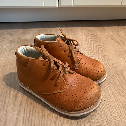 Skoene er laget i skinn og har borrelås-lukking over vristen.