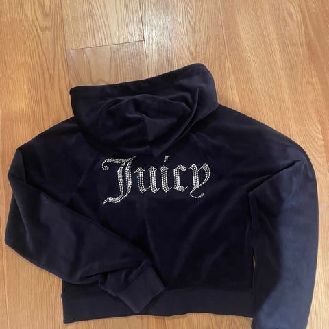 Juicy Couture bluse for dame i størrelse S. Blusen er i blå fløyel og har hette og glidelås foran. Modellen har lommer i front og dekorativ Juicy-logo på ryggen. Passer som en myk og behagelig overdel til hverdagsbruk. 500 kr pr stk eller 800 for 2 stk