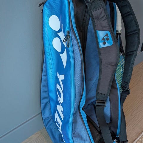 Yonex racketbag i svart med blå detaljer. Bagen har flere glidelåsrom med polstret og delvis isolert innside, egnet for oppbevaring og transport av racketer og tilbehør til racketidretter som badminton, tennis eller squash. Bærehåndtak og skulderstropp gjør den enkel å bære. Materialet er syntetisk tekstil med forsterket utside og strukturert panel på den ene siden for ekstra beskyttelse av innholdet.