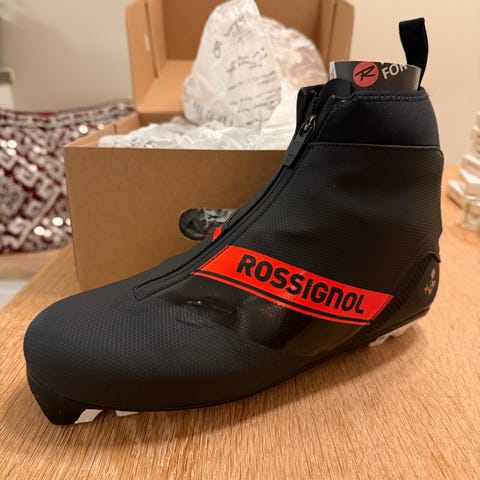 Rossignol X-10 Classic langrennsstøvler i størrelse EU 42. Modellen er beregnet for klassisk langrenn. Støvlene har overdel i syntetisk materiale med glidelås i front og høy mansjett for bedre støtte og beskyttelse mot snø. Sålen viser minimal bruk.
