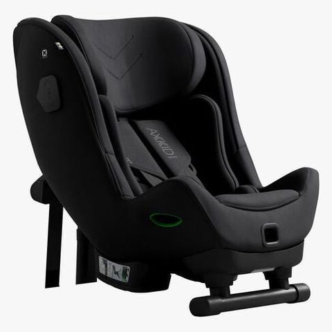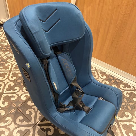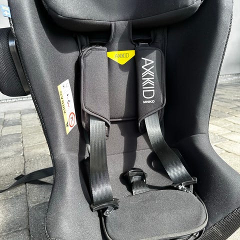 Axkid barnesete i svart farge. Setet har intern 5-punktssele og justerbar nakkestøtte. Selges med ekstra pute/innlegg og festestropper, som vist på bildene. Trekket er i tekstil og setet er beregnet for montering bakovervendt i bil. Egner seg for barn opptil 36kg og 61-125cm.