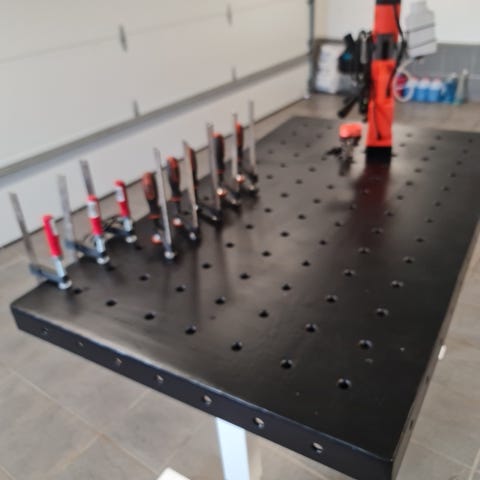 Laget av 12mm stål s355j2+N, utstyrt med ben med høydejustering 80-90 cm og to avstivningsribber under bordplaten.
